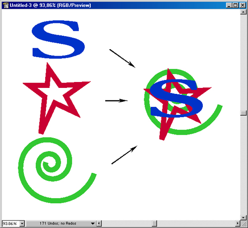 Расположение объектов в вертикальной "стопке" В векторных программах, в том числе в программе Adobe Illustrator, все объекты независимы друг от друга: каждый объект можно произвольно перемещать и трансформировать без малейшего влияния на другие объекты. Однако если объекты перекрываются, то проявляется единственная зависимость их друг от друга: объект с заливкой, который располагается на самом верхнем уровне может перекрывать любые нижележащие объекты. Расположение векторных объектов на плоскости напоминает принцип аппликации (рис. 6.8): объект, который "пришивается" или "приклеивается" раньше может перекрываться объектом, который "пришивается" или "приклеивается" позже. Это означает, что все векторные объекты располагаются в виде некоторой бесконечной "стопки". Даже самый невзрачный объект располагает своим собственным уровнем в общей "стопке". Естественно, что объекты этой "стопки" могут свободно "тасоваться". Дальнейшим развитием принципа аппликации является механизм слоев (layers), о которых пойдет речь в главе 10.