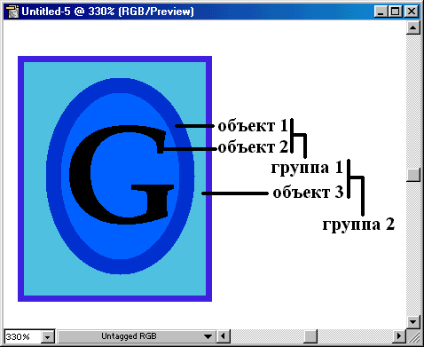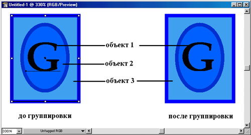 Для того чтобы поместить совокупность объектов в группу, их необходимо выделить и выполнить команду Group (Сгруппировать) меню Object (Объект). Для обратной операции предназначена команда Ungroup (Разгруппировать) того же меню.