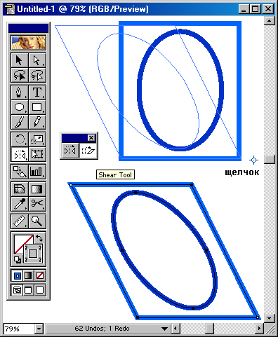 или вертикально в зависимости от того, по какой из осей требуется сдвиг. По умолчанию наклон осуществляется относительно геометрического центра объекта. Если требуется наклон относительно другой точки, то точку "привязки" (центр трансформирования) можно переместить щелчком мыши при включенном инструменте Shear (Наклон). Затем следует перемешать курсор мыши в нужном направлении, при достижении желаемого результата отпустить кнопку мыши.