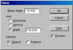 Для перемещения точки "приложения" (центра преобразования) перед вызовом диалогового окна следует удерживать клавишу [Alt]. Поле Shear (Угол наклона) служит для ввода значений угла сдвига, который отсчитывается от линии, перпендикулярной оси сдвига, а ось определяется при помощи переключателя Axis (Ось): Horizontal (Горизонтальная), Vertical (Вертикальная), Angle (Под углом). В последнем случае наклонная ось определяется в градусах по отношению к оси X.