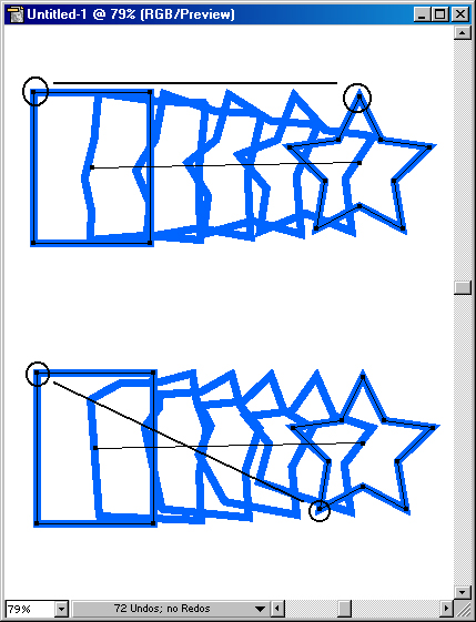 Команда Make (Создать) меню Object/Blends (Объект/Превращение) позволяет создать "группу превращения" без указания на опорные точки. Достаточно выделить необходимые объекты и выполнить команду.
