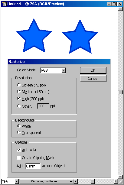 Для конвертирования следует выделить нужные объекты и выполнить команду Rasterize (Растрировать), которая выводит на экран диалоговое окно Rasterize (Растрировать) (рис.