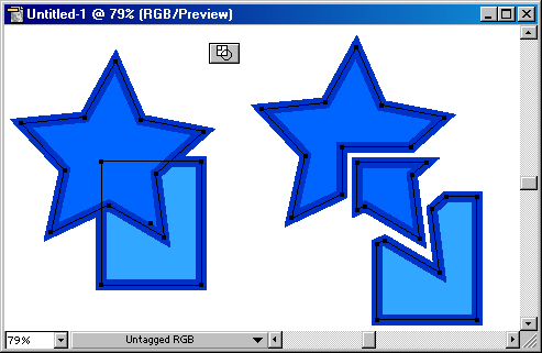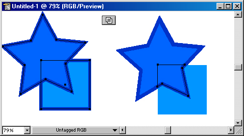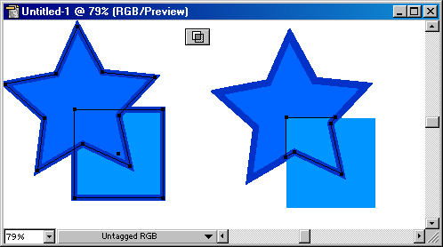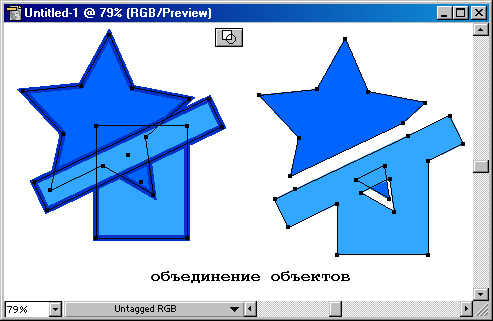 Кнопка Merge (Слияние) комбинирует выделенные объекты таким образом, что удаляет все части объектов, которые являются скрытыми, при этом объекты с одинаковыми заливками объединяются (рис.