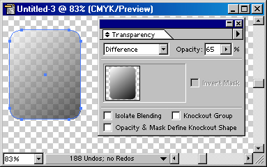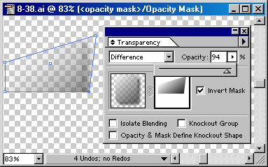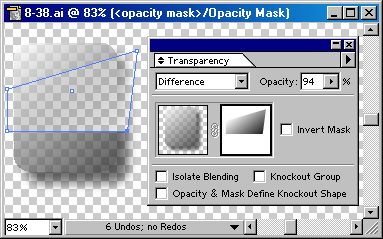 У маски непрозрачности можно изменять форму, если выделить миниатюру маски в палитре Transparency (Прозрачность) и щелкнуть на ней с нажатой клавишей [Alt]. Объект, который служит маской, выделяется и становится доступным для редактирования. Все производимые изменения тут же отображаются в палитре (рис. 8.39). По завершении операции необходимо снова щелкнуть на миниатюре маски.