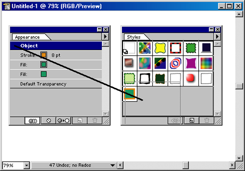 Для того чтобы заменить стиль на новый, можно выполнить команду Replace <имя стиля> (Заменить) в палитре Appearance (Внешний облик). Все объекты, группы или слои, которым присвоен измененный стиль, также меняют свой вид.