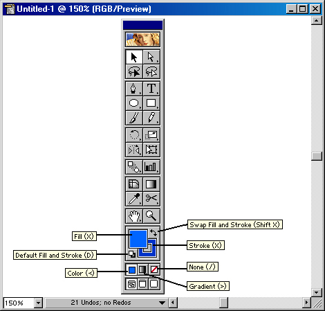 Там же расположены переключатель цветов заливки и обводки Swap Fill and Stroke (Переключатель заливки и обводки) ( Для того чтобы оперативно активизировать индикатор заливки вместо индикатора обводки или наоборот, достаточно нажать клавишу латинской [х], а для того чтобы обменять цвета заливки и обводки следует нажать клавиши [Shift]+[x]. Под индикаторами цвета расположены еще три кнопки, имеющие отношение к цвету.