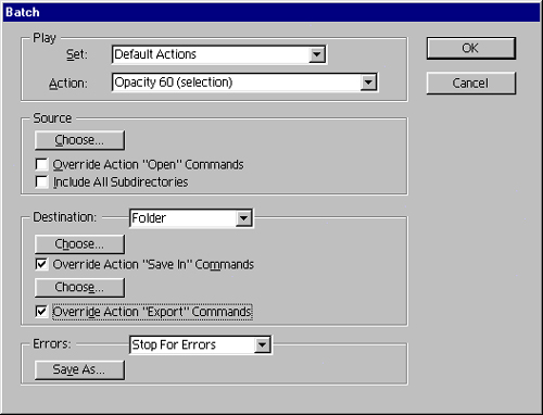 В группе Play (Выполнить) расположены два списка, в которых происходит . выбор набора макрокоманд (список Set (Набор)) и конкретной макрокоманды (список Action (Операция)). В группе Source (Источник) представлена кнопка Choose (Выбрать), которая позволяет определить папку-источник документов, предназначенных для пакетной обработки. Лишних документов в этой папке быть не должно. Невозможность создавать списки документов, предназначенных для пакетной > обработки, — существенное ограничение весьма полезной функции, поскольку нужно заводить специальную папку и переписывать туда-документы для пакетной обработки. Флажок Override Action "Open" Commands (Игнорировать команды "Сохранить в") следует установить, если необходимо предотвратить сохранение обработанных документов в папках, установленных по умолчанию в диалоговых окнах команд Save As (Сохранить как) и Save a Copy (Сохранить копию). Флажок Include All Subdirectories (Включить все подкатологи) позволяет обрабатывать документы, расположенные во вложенных папках. Группа Destination (Результат) служит для определения конечного назначения документов после обработки, в раскрывающемся списке можно выбрать следующие варианты: