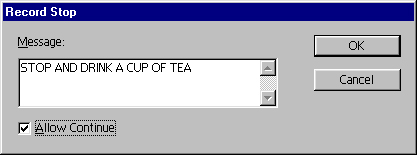 В поле Message (Сообщение) можно ввести произвольный текст, который будет выводиться при остановке макрокоманды. При установке флажка Allow Continue (Разрешить продолжение), в диалоговом окне-сообщении выводится кнопка Continue (Продолжить), как в примере на рис. П1.9.