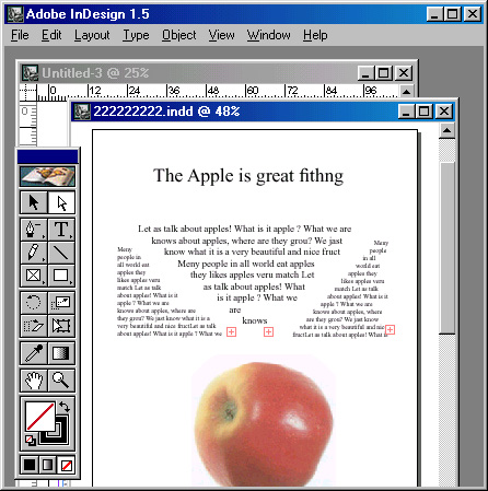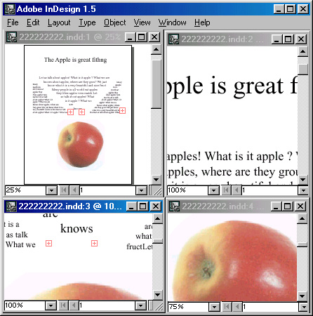 назад | содержание | вперед Работа в нескольких окнах В программе может быть открыто одновременно несколько документов. При открытии окно каждого последующего документа закрывает собой окно предыдущего. Для переключения между документами используется список в нижней части меню View. В этом списке каждая строка соответствует открытому окну. Окно, в строке которого установлен флажок, активно. Переключение активных окон осуществляется выбором одной из строк. Размеры окон документа меняются стандартным образом. При уменьшении окна под ним обнаружится окно другого открытого документа (если таковой имеется). Команды Cascade и Tile организуют просмотр всех окон одновременно (рис. 1.47). В InDesign возможен просмотр документа одновременно в нескольких окнах. Каждое из окон документа отображается строкой в списке меню View, наряду с окнами других документов. Между этими окнами также можно переключаться, менять их размеры и отображать одновременно на экране. В каждом окне выбирается свой масштаб отображения и режим просмотра (рис. 1.48).