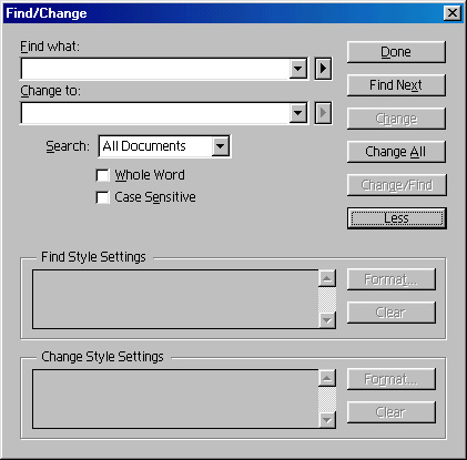 Рис. 10.2. Дополнительные атрибуты поискаДля определения атрибутов нажмите кнопку Format. Перед вами — диалоговое окно Find Format Settings (рис. 10.3). Это большое окно, состоящее из нескольких вкладок. По устройству оно похоже на диалоговые окна редактирования стилей. Выбирая вкладки, задайте те атрибуты, которые вы хотите учитывать при поиске (для области образца) и те, которые вы собираетесь присвоить замененным символам (для области замены). Ниже перечислены вкладки диалогового окна Find Format Settings. Атрибуты, указанные вами в окнах, будут участвовать в процессе, остальные будут проигнорированы.