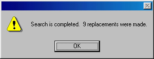 Рис. 10.4. Сообщение о количестве проведенных заменЗакончив работу с окном, закройте его нажатием кнопки Done (см. рис. 10.1, 10.2). Любая замена может быть отменена Если вы изменили решение относительно замены, отмените ее командой Undo Replace Text (или Undo Replace All Text) меню Edit. Можно отменять и серии команд замены. назад | содержание | вперед Поделитесь этой записью или добавьте в закладки |