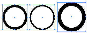 Рис. 11.42. Расположение обводки относительно габаритного прямоугольника и относительно контура В других программах объектной графики изменение толщины обводки влечет за собой изменение общих размеров объекта. Это естественно, но не всегда удобно. InDesign предлагает интересный режим, при котором габаритный прямоугольник (т. е. суммарный размер объекта) остается неизменным, какую бы толщину обводки вы ни задавали. Для задания неизменного размера габаритного прямоугольника снимите флажок Weight Changes Bounding Box, расположенный в меню палитры Stroke. Установленный флажок активизирует режим, переменного габаритного прямоугольника. В первом случае при смене толщины обводки неизмененным остается контур, во втором — общий размер объекта (рис. 11.43).