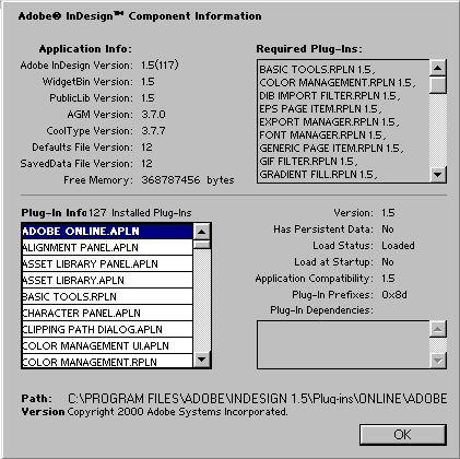 назад | содержание | вперед Редкие форматы Для того чтобы можно было поместить изображение посредством команды Place, InDesign должен располагать фильтром, позволяющим декодировать этот формат. Список всех установленных фильтров для вашей конфигурации InDesign можно получить, выбрав команду About меню Help и удерживая при этом клавиши <Ctrl>+<Alt>. После этого должно открыться окно, представленное на рис. 12.7. Безусловно, содержимое окна зависит от конкретной конфигурации InDesign, и у вас может не быть фильтров и подключаемых модулей, установленных на нашем компьютере, и наоборот.