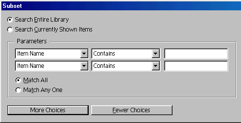 Рис. 12.26. Диалоговое окно SubsetПо умолчанию в диалоговом окне показывается строка только для одного критерия. Каждое нажатие кнопки More Choices открывает строку для еще одного критерия. Пяти таких критериев вполне достаточно для самого сложного поиска. При поиске вы можете задать условия совместного выполнения нескольких критериев. Установка переключателя Match All ставит условием нахождения элемента обязательное сочетание всех критериев поиска. Если установлен переключатель Match Any One, для этого достаточно совпадения любого из критериев. Если вам потребуется более сложное сочетание критериев (например, обязательное одновременное совпадение двух и необязательное еще одного), то вы можете действовать методом последовательных приближений.И, наконец, ненужные элементы палитры удаляются из нее командой Delete Item(s) меню палитры при выделенном в палитре элементе, подлежащем удалению. Еще быстрее это можно сделать щелчком на кнопке с изображением мусорной корзины в нижней части палитры.Импортированные изображения не копируются в файл палитры, а только связываются с ее элементами. Если удалить оригинальный файл изображения с диска, перенести его в другую папку или переименовать, то связь с элементом палитры нарушится. Чтобы библиотека работала правильно, следите за тем, чтобы все связанные с ней изображения сохраняли свои имена и положение на диске. Для создания новых библиотек и открытия существующих имеются команды New Library и Open Library в меню палитры. Библиотека хранится в файле, имя и положение которого вы задаете при создании в стандартном диалоговом окне Windows. Оно предоставляется сразу после выбора команды New Library. Чтобы открыть библиотеку, достаточно указать на любой сохраненный файл библиотеки в аналогичном диалоговом окне. Вы можете открыть одновременно любое количество библиотек (пока не закончится свободная память) и перемещать их элементы из одной в другую перетаскиванием мышью.Размещение элементов библиотеки на странице публикации осуществляется перетаскиванием из окна палитры в пространство страницы или командой Place Item(s) меню палитры. Библиотеки могут хранить практически все типы объектов InDesign и любые их комбинации: