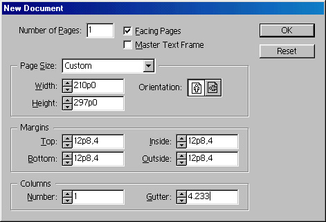 Рис. 14.1. Диалоговое окно New DocumentНиже мы обсудим параметры, определяемые в этом диалоговом окне. Задание числа страниц в публикации. Число страниц устанавливается в поле Number of pages в самом верхнем поле диалогового окна New Document. Если эта цифра точно известна, проставьте ее в соответствующей строке ввода. С другой стороны, заранее задавать число страниц публикации вроде и ни к чему, поскольку при размещении текста, импортированного из формата текстового процессора, InDesign способен автоматически добавлять в документ новые страницы по мере заполнения их текстом (только в режиме автоматического размещения).Установка оборотной печати. Если включить и флажок Facing Pages — то на экране отображаются одновременно обе страницы каждого разворота, внешний вид главного окна будет напоминать книгу, раскрытую на определенной паре страниц. Включенный режим Facing Pages позволяет создавать документы типа книги — с печатью на обеих сторонах бумаги.Фрейм на шаблон-странице. Флажок Master Text Frame создает на шаблон-странице нового документа текстовый фрейм. Размер этого фрейма определяется установленными размерами страниц и полей публикации. Фрейм становится "заготовкой" для последующего автоматического размещения текста. Автоматическое создание фрейма имеет смысл, если верстается преимущественно текстовый материал в одну колонку. В противном случае удобнее задать количество и положение текстовых фреймов на шаблон-странице вручную перед импортом текста.Формат страницы. В раскрывающемся списке Page Size устанавливается размер страниц публикации. Список содержит набор наиболее часто применяемых стандартных размеров листовой бумаги. Если вы собираетесь верстать публикацию для распечатки на принтере, то, скорее всего, вам подойдет один из стандартных размеров листа. Если вашу публикацию предполагается печатать в типографии, скорее всего, она будет нестандартна с точки зрения InDesign, и для нее нужно создать свой размер бумаги. Для такого случая в области Page Size имеются поля ввода Width и Height. В них указываются ширина и высота страницы, соответственно. Как только в них окажется размер, не совпадающий с выбранным в списке Page Size, вместо стандартного размера в нем появится вариант Custom.Возможно, вам захочется задать нестандартный размер страницы даже в случае последующей печати на принтере. Параметры рекламной листовки или страницы брошюры сильно влияют на ее восприятие. Так, вы можете легко организовать изящную книжечку, если при брошюровке будете складывать стандартные листы не поперек, а вдоль. В этом случае размер отдельной страницы составит 210х148. В дальнейшем мы будем обращать ваше внимание на создание оригинального дизайна при помощи нестандартного размера страницы. По поводу размеров страницы публикации. Эта проблема не так проста, как кажется на первый взгляд. Дело в том, что здесь впервые в процессе подготовки публикации вы спускаетесь с творческих небес на грешную землю, где вас уже ждут работники типографии и продавцы бумаги. Перед определением формата будущей книги обязательно свяжитесь с предполагаемой типографией на предмет выяснения их требований к параметрам полосы набора (пространства страницы, отведенного под текст, не считая полей), и точно выясните, возможна ли печать на задуманном вами формате. Бумага для печати, купленная вами, тоже имеет с