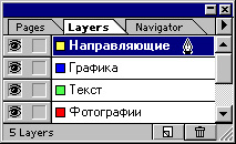 назад | содержание | вперед Палитра слоев Все операции со слоями производятся с помощью одного инструмента — палитры Layers. Она используется для создания, редактирования, закрепления, удаления слоев. В палитре Layers помещены элементы управления атрибутами отдельных слоев. С ее помощью определяется порядок их взаимного наложения. Наконец, палитра слоев служит для перемещения объектов между слоями.Чтобы открыть палитру Layers, выберите команду Show layers меню Window. Клавиатурное сокращение для вызова палитры слоев — <F7>. На экране появится палитра, изображенная на рис. 15.27. О принципах работы и о стандартных элементах палитр можно прочитать в главе 1.