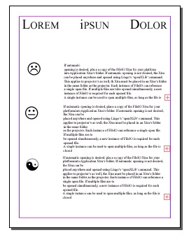 Рис. 16.27. Одноколоночный макет с маргинальными элементамиЗачем же прибегать к специальным приемам, когда можно сделать две настоящих колонки и разместить маргинальные элементы в левой, а основной текст в правой? Ответ очевиден: маргинальные элементы по смыслу привязаны к определенным строкам основного текста и при изменении размещения основного текста не должны утрачивать этой привязки. Если расположить их в отдельной колонке, то настраивать положение маргинальных элементов относительно основного текста вам пришлось бы вручную и каждый раз заново при малейшем изменении форматирования основного текста. Оформление маргинальных элементов как висячих позволяет не заботиться об их расположении относительно соответствующих строк основного текста, т. к. они включены в эти строки. В этом случае изменение форматирования и добавление или удаление основного текстового материала не приведет к необходимости ручного размещения маргинальных элементов. После того как висячий отступ создан (см. главу 7), в него может быть помещен любой графический элемент. Очевидно, этот элемент будет вложенным. Такие висячие графические элементы служат великолепным средством выделения и оригинальным элементом дизайна. Они могут использоваться как маркеры элементов перечня или небольших фрагментов текста (рис. 16.28).