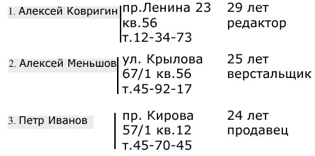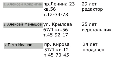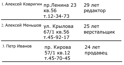 Рис. 16.32. Сочетание абзацных и вертикальных линеекСовместным использованием приведенных "трюков" можно получить множество интересных вариантов оформления таблиц (рис. 16.32). Обратите внимание на пробелы между строками таблицы. Они тоже получены с помощью абзацных линеек цвета бумаги, заданных в стиле. Эти линейки закрывают фрагменты вложенной вертикальной линейки. назад | содержание | вперед Поделитесь этой записью или добавьте в закладки |