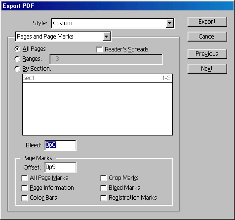 Рис. 17.11. Раздел Pages and Page Marks диалогового окна Export PDFПо умолчанию документ экспортируется целиком, что соответствует положению All Pages переключателя, находящегося в верхней части диалогового окна. Если установить флажок Reader's Spreads, то в PDF-документе окажутся не отдельные страницы публикации, а развороты. Флажок действует только в том случае, если документ рассчитан на оборотную печать (в диалоговом окне Document Setup установлен флажок Facing Pages).В положении переключателя Ranges становится доступным соседнее поле ввода. В него через запятую можно ввести номера экспортируемых страниц или их диапазонов. Например, при вводе 1-6,8,12- будут экспортированы страницы: с первой по шестую, восьмая и с двенадцатой до конца документа.Если в документе определено несколько разделов, то их можно экспортировать в формат PDF выборочно. Для этого следует перевести переключатель в положение By Section. В расположенном ниже списке разделов щелчком кнопкой мыши выделите только требующиеся разделы. Смежные разделы можно выбрать щелчком на первом и последнем разделах при нажатой клавише <Shift>. Для выделения несмежных разделов удерживайте нажатой клавишу <Ctrl>.Поле Bleed и элементы управления области Page Marks используются только при подготовке документа для типографской печати. Они задают соответственно выступ для печати навыпуск и простановку типографских меток. Подробное обсуждение этих установок отложим до главы 19.назад | содержание | вперед Поделитесь этой записью или добавьте в закладки |
