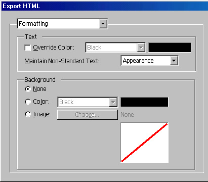 назад | содержание | вперед Форматирование В разделе Formatting (рис. 17.2) находятся элементы управления форматированием текста и выбором фонового изображения или сплошной заливки.Флажок Override Color в области Text заставляет InDesign использовать для текста на Web-странице только выбранный цвет, независимо от его цвета в публикации. Флажок очень удобен, если в публикации для текста использованы плашечные цвета или оттенки серого. Цвет текста можно выбрать в списке или палитре цветов Windows/Macintosh, которая открывается щелчком на расположенном справа образце цвета.