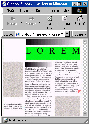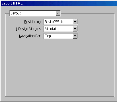 Рис. 17.4. Диалоговое окно Export HTML, раздел LayoutВариант Best (CSS-1) устанавливает спецификацию HTML 4.0, использующую для позиционирования элементов макета слои и стилевые листы (CSS, Cascading Style Sheets). CSS позволяют хорошо воспроизводить размещение элементов макета, включая наложение объектов. Примеры Web-страниц, полученных при разных установках в списке Positioning, приведены на рис. 17.5.Сгенерированные стилевые листы размещают каждый объект на своем слое, используя свойство z-index. К сожалению, фильтр экспорта HTML не анализирует стилевое оформление публикации в целом и внедряет стилевые листы в каждый HTML-файл со страницей, а не связывает один стилевой лист со всеми файлами. Список InDesign Margins определяет, будут ли при экспорте в HTML сохранены размеры полей, заданные на странице публикации. Вариант Maintain сохраняет поля, a None удаляет их полностью.