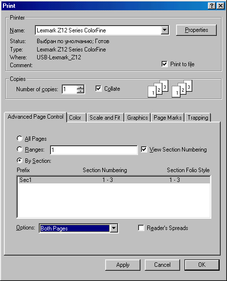 назад | содержание | вперед Настройки печати Печать из InDesign мало чем отличается от печати из любого приложения Windows. Но все просто до тех пор, пока дело не доходит до печати оригинал-макета. В этом случае существует множество тонкостей, знание которых необходимо для успешного вывода и тонкого управления устройством печати. Любой фотонаборный автомат является PostScript-устройством и далее (если прямо не указано противоположное) мы будем говорить именно о выводе на устройства, поддерживающие PostScript. На рис. 19.10 представлено диалоговое окно Print, которое открывается при выборе одноименной команды меню File.