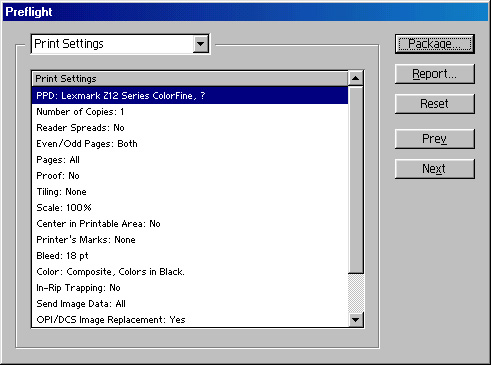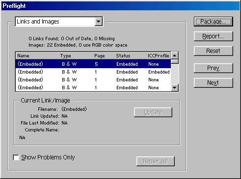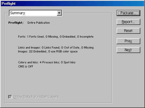 назад | содержание | вперед Проверка публикации Проверка большой публикации с множеством связанных файлов может оказаться сложной и кропотливой. К счастью, InDesign имеет встроенное средство проверки, позволяющее исключить грубые ошибки. Речь идет о команде Preflight меню File.Выбор этой команды меню запускает программу проверки публикации на предмет связанных файлов и использованных шрифтов. После некоторого "размышления", продолжительность которого зависит от длины и сложности публикации, InDesign откроет диалоговое окно (рис. 19.27), содержащее результаты проверки. Диалоговое окно Preflight организовано типичным для InDesign образом: оно содержит пять разделов, переключающихся выбором в списке в верхней части окна или кнопками Next и Prev. Разделы диалогового окна содержат следующую информацию: