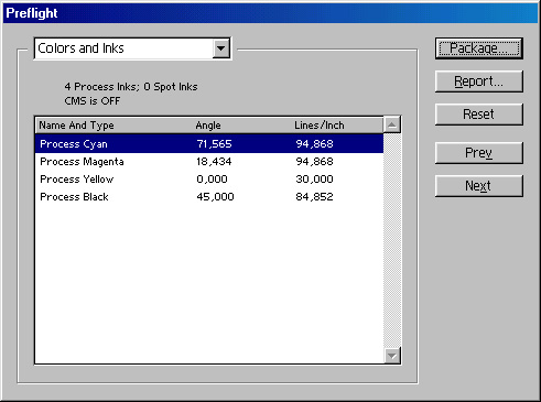 Рис. 19.31. Диалоговое окно Preflight, раздел Colors and InksВся информация, отображаемая в диалоговом окне Preflight, может быть сохранена в текстовом файле в виде отчета кнопкой Report. Этот текстовый файл можно приложить к публикации при предоставлении ее в сервис-бюро. Впрочем, если вы предоставляете в сервис-бюро верстку и пользуетесь командой Package, то делать это не нужно: данная команда сама создаст файл отчета.назад | содержание | вперед Поделитесь этой записью или добавьте в закладки |
