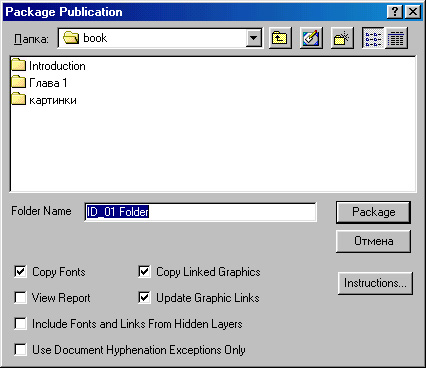 назад | содержание | вперед Сборка файлов публикации После того как публикация еще раз проверена и ошибки не обнаружены, самое время "собрать в кучку" все файлы публикации для передачи в сервис-бюро. Для этих целей служит диалог, открываемый кнопкой Package в диалоговом окне Preflight или отдельной командой меню File (рис. 19.32, а). Он позволяет записать в отдельную папку все файлы, требующиеся для печати (пакет). Установив флажок Copy Fonts, вы даете указание скопировать в эту папку все шрифты, использующиеся в публикации. Флажок Update Graphic Links полезен при сохранении публикации, уже проверенной в прошлом сеансе работы. Если установлен флажок Copy Linked Graphics, в пакет автоматически помещаются все связанные внешние файлы.