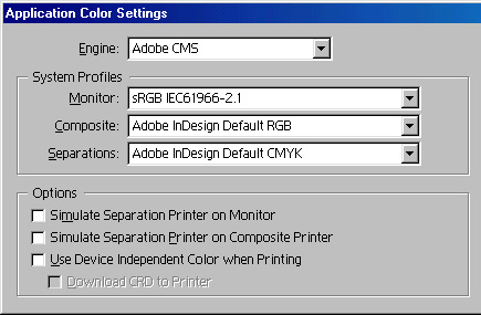 назад | содержание | вперед Установки Color SettingsМеню File содержит вложенное меню Color Settings, команды которого открывают диалоговые окна настройки системы управления цветом InDesign. Система управления цветом ( Color Management System, CMS) не осуществляет цветокоррекцию: она не может из "плохого" изображения сделать "хорошее". Задача системы управления цветом состоит в точной передаче цветов между всеми устройствами, занятыми в подготовке и печати публикаций (сканеров, мониторов, принтеров, типографских станков, и т. п.). Чтобы решить эту задачу, системе управления цветом требуются точные описания всех параметров цветопередачи для каждого устройства. Процесс получения таких описаний называется калибровкой, а сами описания представляются в виде цветовых профилей. Таким образом, система управления цветом работает только с калиброванными устройствами.В поставку InDesign входят системы управления цветом Adobe (Adobe CMS) и Kodak (Kodak Precision CMS). Вы можете работать с любой из них или установить CMS другого производителя. Выбор системы управления цветом, используемой по умолчанию, осуществляется в диалоговом окне Application Color Settings, открывающемся одноименной командой вложенного меню Color Settings (рис. 3.14).Раскрывающийся список Engine содержит перечень всех установленных на вашем компьютере CMS. Ниже, в области System Profiles находятся трисписка, в которых следует выбрать профили для используемого оборудования: