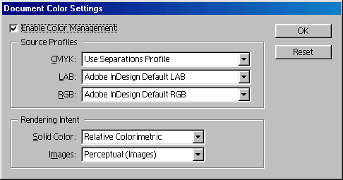 Рис. 3.15. Диалоговое окно Document Color SettingsВ верхней части диалогового окна Document Color Settings находится флажок Enable Color Management. Если его не установить, то система управления цветом будет отключена!В области Source Profiles находятся три списка. В них вы можете выбрать исходные цветовые профили для объектов, которые ими не располагают. Разумеется, для объектов в разных цветовых моделях используются разные профили: CMYK, LAB, и RGB.Устройства, занятые в полиграфическом процессе, имеют различные цветовые охваты. Иными словами, не все цвета, передаваемые одним устройством, могут быть переданы на другом. Наиболее типичный пример — монитор и принтер. На принтере невозможно полупить, например, тот ярко-зеленый цвет, который вы видите на мониторе. Для цветов, которые выходят за пределы цветового охвата целевого устройства, система управления цветом выбирает гот вариант преобразования, который указан в области Rendering. Intent диалогового окна Document Color Settings. Для точечных изображений и векторной графики можно использовать различные схемы. Вот они:Исходные профили и метод преобразования цветового охвата задаются в диалоговом окне Document Color Settings по умолчанию. Если вы хотите назначить отдельным импортированным объектам индивидуальные исходные профили, то это легко сделать с помощью диалогового окна Image Color Settings. Это диалоговое окно и системы управления цветом более подробно освещены в главе 5.назад | содержание | вперед Поделитесь этой записью или добавьте в закладки |