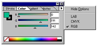 Рис. 4.8. Палитра Color В палитре можно редактировать цвет в моделях RGB, CMYK и Lab. Переключение между моделями производится в меню палитры. В отличие от некоторых других программ, переключение на соответствующую модель цвета в палитре означает задание данной модели цвета в публикации. Поясним процесс создания цвета на примере.