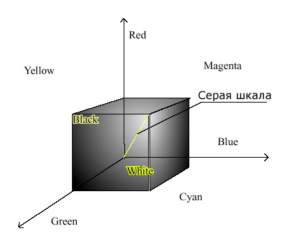 назад | содержание | вперед Модель CMYK Несветящиеся объекты поглощают часть спектра белого света, освещающего их, и отражают оставшееся излучение. В зависимости от того, в какой области спектра происходит поглощение, объекты отражают разные цвета и представляются ими окрашенными. Цвета, которые образуются отражением части спектра белого цвета, называются субтрактивными ("вычитательными") (рис. 4.4). Для их описания используется модель CMY. В этой модели основные цвета образуются путем вычитания из белого цвета основных аддитивных цветов модели RGB. Понятно, что в таком случае и основных субтрактивных цветов будет три: голубой (белый минус красный), пурпурный (белый минус зеленый), желтый (белый минус синий). При смешениях двух субтрактивных составляющих результирующий цвет затемняется (поглощено больше света, положено больше краски). Таким образом, при смешении максимальных значений всех трех компонентов должен получиться черный цвет. При полном отсутствии краски (нулевые значения составляющих) получится белый цвет (белая бумага). Смешение трех компонентов в равных количествах даст оттенки серого. Модель CMY (рис. 4.5) можно представить себе в виде трехмерного куба, аналогичного представлению RGB с перемещенным началом координат. Данная модель используется для печати цветных изображений. Пурпурный, голубой, желтый цвета составляют так называемую полиграфическую триаду. При печати этими красками довольно большая часть видимого цветового спектра может быть репродуцирована на бумаге. Ясно, что модель CMY аппаратно зависима — ведь в образовании цвета, участвуют краски и бумага. В зависимости от их свойств, цвет, имеющий одни и те же характеристики, будет выглядеть по-разному.