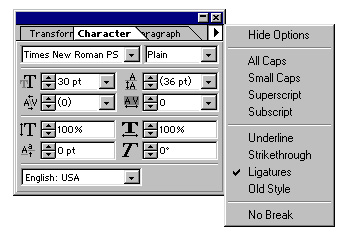 Рис. 6.20. Палитра CharacterКак видно из рисунка, палитра располагает собственным меню. Выбрав команду-переключатель Show Options, вы увеличите количество доступных для редактирования атрибутов. Если палитра полностью раскрыта, эта команда меняет вид на Hide Options, и при ее выборе часть полей становится не вид на. Последняя команда меню — также переключатель, он изменяет ориентацию палитры.Некоторые поля ввода палитры снабжены всплывающими подсказками. Мы будем называть эти поля в тексте именно так, как они названы в подсказках. назад | содержание | вперед Поделитесь этой записью или добавьте в закладки |