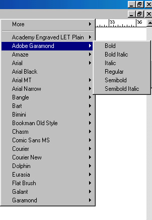 назад | содержание | вперед Гарнитура, начертание и кегль в меню программы Иногда удобно для определения характеристик шрифта пользоваться командами меню Type.Команда Font раскрывает список установленных шрифтов. Скорее всего, их набор на вашем компьютере будет отличаться от приведенного на рис. 6.21. Если установлено много шрифтов, и этот список очень длинный, то в верхней части есть пункт More, перейдя к которому вы откроете следующую "страницу" шрифтов. Если гарнитура имеет несколько начертаний, они перечислены во вложенных списках. Справа от строки гарнитуры, имеющей несколько начертаний, есть треугольная стрелка. Когда вы подведете курсор к нужной строке, список начертаний откроется (рис. 6.21).