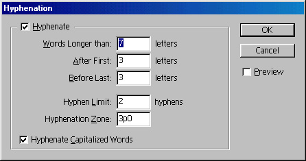 назад | содержание | вперед Установка переносов Регулирование режима переноса производится флажком Hyphenate палитры Paragraph. Если этот флажок снят, то слова, которые не помещаются на строке, целиком переносятся строкой ниже, без всяких переносов. В этом случае единственным возможным приемом является вставка дискреционного, "мягкого" переноса. Это специальный символ, имеющий вид дефиса и вставляемый клавиатурной комбинацией <Ctrl>+<Shift>+<-> (минус). Если слово выходит за границу текстового блока, и в нем есть дискреционный перенос, то оно будет перенесено в соответствующем месте. Если дискреционного переноса нет, слово целиком переходит на следующую строку. При редактировании текста или изменении атрибутов символов и абзаца, слово, в котором есть позиция мягкого переноса, смещается, и необходимость в его переносе может отпасть. В таком случае мягкий перенос перестает быть виден. Если слово опять переместится таким образом, что его необходимо будет переносить, оно вновь будет разорвано по указанной точке переноса. Переносы вручную производятся для небольших объемов текста и для текстов на языках, которые не входят в поставку программы.