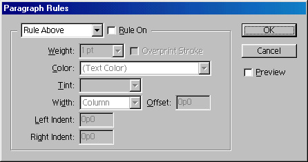 назад | содержание | вперед Абзацные линейки Следующий атрибут абзаца относится к остальным, как галстук к костюму — это украшение, но иногда без него просто не обойтись. Гибкий и простой инструмент задания линеек абзаца — диалоговое окно Paragraph Rules — вам наверняка понравится. Линейки — простои и эффектный прием отделения заголовка. Кроме того, они широко применяются для верстки таблиц.Диалоговое окно (рис. 7.25) открывается одноименной командой меню палитры Paragraph. Оно состоит из двух вкладок, переключаемых в списке в верхней части — Rule Above, в которой задаются свойства верхней линейки, и Rule Below, вкладка свойств нижней линейки.