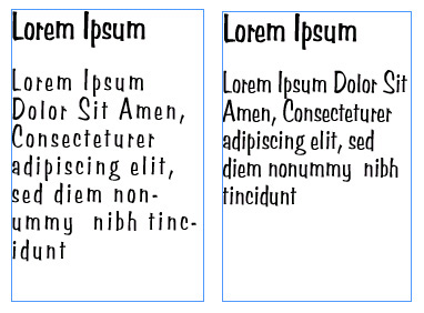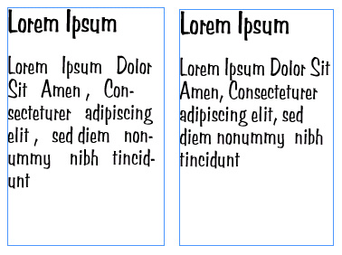Рис. 7.3. Пробелы в первом отрывке больше, чем во второмПри разработке шрифта кроме рисунка литеры и ширины пробела задается и межсимвольное расстояние. Оно определяется величиной оптического поля буквы. Оптическое поле состоит из ширины собственно символа и боковых полей, примыкающих к нему. Величина бокового поля входит в состав шрифта, а не проявляется при наборе как кернинг и трекинг. Межсимвольное расстояние складывается из боковых полей соседних букв. В программах верстки оно также может быть изменено. Этот параметр меняют обычно незначительно, в пределах 5—10%, однако его влияние на внешний вид и объем текста весьма велико (рис. 7.4). Многие специалисты советуют избегать самостоятельной регулировки межсимвольного расстояния, говоря, что это искажает оптическое поле литер и приводит к порче внешнего вида текста. Определенные пользователем параметры интервалов точно соблюдаются лишь для текста с рваным краем. Для выключенного по формату текста ширина пробела колеблется в зависимости от плотности заполнения строки. В этом случае задается уже не один параметр пробела, а три — минимальный, желаемый и максимальный. Руководствуясь этими значениями, программа увеличивает или уменьшает расстояния между символами и пробелы между словами, чтобы уложить текст в отведенные рамки. Стараясь соблюсти желаемые значения, она при необходимости увеличивает или уменьшает интервалы, но не более, чем на заданные допустимые отклонения. Для соблюдения интервалов используются автоматические переносы слов и в редких случаях — также автоматически — производится подстройка ширины символов. Случается, однако, что выполнить корректировку межсимвольных интервалов с учетом заданных значений в данной строке невозможно. Так бывает, например, если в тексте много слов, которых нет в словаре переносов, или в случае выбора слишком крупного кегля для данной длины строки. В этом случае программа верстки выполняет выключку как может. В результате на строке может быть расположено слишком мало символов, расстояния между ними становятся гораздо больше, чем в остальном тексте. Такая строка называется жидкой. Если символов слишком много, то образуется плотная строка. В InDesign, как и в других современных пакетах обработки текста, такие строки выделяются подсветкой. При взгляде на страницу пользователь сразу видит, где требуется его вмешательство — в какой строке требуется вставить ручной перенос, изменить кернинг или трекинг и пр.