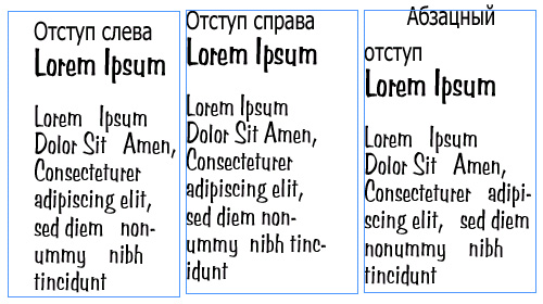 Рис. 7.5. Три типа отступовОтступы слева и справа применяются для верстки заголовков, стихов, эпиграфов. Иногда верстка с отступом используется и в основном тексте, в этом случае на образовавшемся поле можно расположить иллюстрации, заголовки-форточки и прочие элементы оформления (рис. 7.6). Такая верстка уместна при оформлении учебников и журнальных статей.
