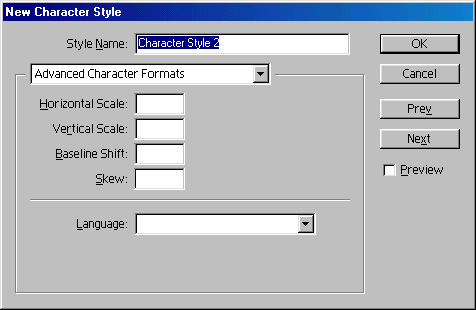 назад | содержание | вперед Вкладка Advanced Character FormatsВ этой вкладке (рис. 8.7) продолжается задание атрибутов символов. Здесь собраны атрибуты масштабирования по горизонтали и вертикали, наклона и смещения базовой линии. В нижнем раскрывающемся списке выбирается язык символов. В этом списке присутствует не весь список языков, поддерживаемых программой, а только языки, использованные в публикации, плюс язык программы по умолчанию (тот, который устанавливается при инсталляции, обычно — американский вариант английского языка). Возможен также выбор пункта [No Language], тогда символы, отформатированные этим стилем не будут подвергаться проверке орфографии и переносам. Если оставить поле пустым, сохраняется язык, заданный локально или в стиле абзаца. Все поля и списки этой вкладки также представляют собой обычные атрибуты символов и описаны в главе 6.