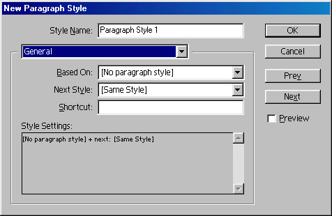 Рис. 8.9. Диалоговое окно New Paragraph Style, вкладка GeneralКак и в окне задания стиля символов, поле Style Settings отведено для описания данного стиля — в нем в квадратных скобках названы базовый и последующий стили, а затем перечислены заданные атрибуты.назад | содержание | вперед Поделитесь этой записью или добавьте в закладки |