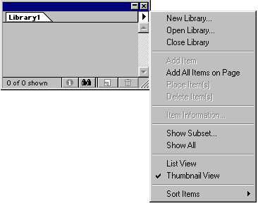 Рис. 8.12. Команды работы с библиотекамиКоманда New предназначена для создания новой библиотеки. При ее выборе открывается диалоговое окно создания файла, в котором вы задаете расположение и имя для новой библиотеки (она может располагаться на любом диске, в том числе и сетевом). После нажатия кнопки ОК перед вами — новая, пустая палитра библиотеки (рис. 8.13, а). В ней могут храниться любые объекты — текст, рисунки, растровые изображения. Для помещения в нее элемента (в нашем случае текстового блока) выделите его и перетащите в область палитры или выберите команду New Item. Миниатюра с изображением выбранного фрагмента появится в окне палитры (рис. 8.13, б). Двойной щелчок на миниатюре или команда Item Information открывает одноименное диалоговое окно (рис. 8.14). В нем задается имя объекта, дата создания, из списка Object Type выбирается тип объекта (в нашем случае — текст) и дается краткое описание объекта, содержащее ключевые слова для последующего поиска. Задавайте для объекта значащее имя (в данном случае наиболее логично назвать его по имени стиля) и внятное описание. Это облегчит поиск, если ваша библиотека впоследствии разрастется.