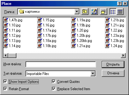 Рис. 9.27. Диалоговое окно PlaceВ нижней части окна расположены флажки преобразования формата. Они позволяют выполнить некоторые элементы форматирования в процессе импорта. При установке флажка Retain Format можно сохранить форматирование текста, выполненное в стороннем приложении. Если сбросить этот флажок, текст будет импортирован вообще без форматирования (как текстовый файл).Установка флажка Convert Quotes ведет к автоматической замене прямых кавычек полиграфическими, а двойных минусов — полиграфическими тире. Такая первичная обработка текста очень удобна при импорте ASCII-файлов.При снятом флажке Show Import Options фильтр импорта работает по умолчанию. Если флажок установить, то при нажатии кнопки Open, или двойном щелчке на имени импортируемого файла откроется окно дополнительных возможностей фильтра импорта данного формата. К такому же результату приводит открытие импортируемого файла при нажатой клавише <Shift>.назад | содержание | вперед Поделитесь этой записью или добавьте в закладки |