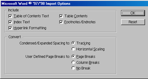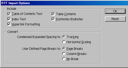 Рис. 9.29. Настройка фильтра импорта файла в формате Microsoft Word старых версийДля новых версий Microsoft Word предусмотрен отдельный фильтр импорта. Тот же фильтр используется и при импорте файлов в формате RTF. Диалоговое окно настроек фильтра (рис. 9.30) предлагает выбрать специальные элементы текстового процессора, которые должны быть включены в публикацию InDesign, и способ конвертирования отдельных атрибутов.