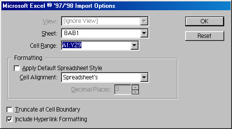 Рис. 9.31. Диалоговые окна импорта файлов ExcelПри подготовке таблиц вы можете использовать различные приложения: текстовые процессоры, редакторы электронных таблиц. Наконец, данные таблицы могут располагаться в базах данных как универсальных, так и специальных. В результате импорта таблица преобразуется в текст. Столбцы ее разделяются табуляторами, а строки — признаками конца абзаца. Таким образом, для того чтобы упростить верстку таблицы, нужно заранее подготовить импортируемый материал. Это делается, во-первых, с помощью средств порождающего приложения. В нем можно разметить таблицу тэгами для сохранения локального форматирования (см. ниже в этой главе). Иногда нужно произвести преобразование формата данных в приложении. Затем приступайте к импорту. Если приложение имеет фильтр импорта в InDesign, то при импорте можно настроить установки фильтра в соответствии с требованиями, предъявляемыми к таблице. Текстовые файлы, импорт которых рассмотрен раньше, очень часто используются для импорта таблиц. Текст таблицы может быть набран непосредственно в текстовом формате, или преобразован в него из приложений, которые не имеют фильтра импорта в InDesign. Кроме текстовых форматов, в InDesign можно непосредственно импортировать таблицы Microsoft Word. О фильтре импорта этих файлов рассказано выше. Единственный редактор электронных таблиц, файлы которого можно сразу поместить в InDesign, — это Microsoft Excel. Программа имеет два фильтра импорта — для файлов версий Microsoft Excel 5.0/95 и Microsoft Excel 97/98 (рис. 9.31). При импорте вы можете изменять следующие настройки:
