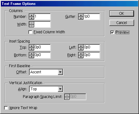 Рис. 9.19. Диалоговое окно Text Frame OptionsВ области Columns задается размер и число колонок. До тех пор пока в поле Number установлено значение 1, вы можете задать ширину фрейма в поле Column width. После установки ширины колонок задайте их число в поле Number.