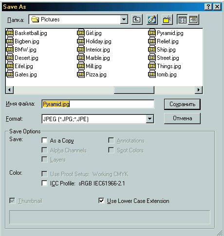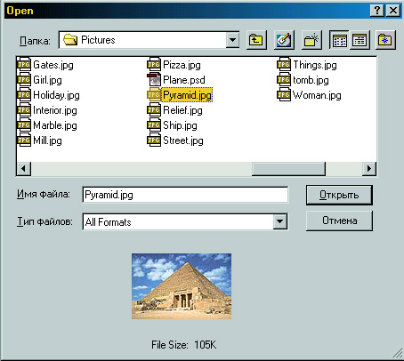 Рис. 1.9. Диалоговое окно Open Рядом с названиями команд в меню Photoshop указаны их клавиатурные эквиваленты. Обращайте на них внимание и старайтесь запомнить. Применение клавиатуры существенно ускоряет работу с программой. Наиболее часто используемые клавиатурные эквиваленты будут указываться при выполнении учебных упражнений. 3. Раскрывающийся список Files of type (Тип файлов) содержит форматы файлов, которые могут быть открыты в программе. Те файлы, формат которых активен в списке, видны в поле просмотра. Выберите в списке строку JPEG (*. jpg). Теперь в окне показаны файлы только этого формата. Если в списке установлена строка All Files, видны все файлы активной папки. 4. В поле просмотра выберите файл Pyramid.jpg. В нижней части окна появилась миниатюра изображения, находящегося в файле. Под ней, в поле File Size (Размер файла) указан размер файла в килобайтах. 5. Нажмите кнопку Open (Открыть). Перед вами — окно документа (рис. 1.10). В нем представлено изображение, хранящееся в файле. В заголовке окна есть название документа, его формат, масштаб просмотра на экране, здесь могут приводиться и дополнительные данные об изображении. СоветПеред началом работы с документами, прилагаемыми к книге на Дискете, Скопируйте их в рабочую папку на жестком диске, и больше с этой дискетой не работайте. Она станет резервной копией. если по какой-то причине учебный файл будет испорчен, вы всегда сможете восстановить его с дискеты.