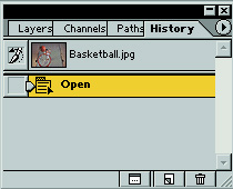 10.Маленький мяч рядом с корзиной по замыслу лежит на полу. Следовательно, корзина должна быть видна над мячом. Требуется вернуть точки, которые мы закрыли изображением шарика. Для частичного возврата к любому из состояний используется специальный инструмент History Brush (Кисть возврата) 11.Щелкните на пустой кнопке слева от второго снимка состояния. На кнопке появилась пиктограмма кисти (рис. 3.79). Установлено состояние-источник, из которого будут восстанавливаться фрагменты изображения. Это может быть как снимок, так и любое состояние из протокола. 12.Выберите инструмент History Brush (Кисть возврата). Он использует кисти, режимы наложения и прозрачность, но рисует точками состояния-источника, а не точками рабочего цвета. 13.Толщину кисти определите такой же, как толщина обода корзины на изображении. Кисть должна иметь жесткие края. Режим сглаживания оставьте включенным. 14.Очень аккуратно, при большом увеличении, проведите кистью по изображению. Повторяйте очертания обода, закрытого мячом. Там, где прошла кисть, изображение восстанавливается (рис. 3.80). Если это необходимо, воспроизведите также сетку, выбрав очень тонкую кисть. Рис. 3.79. Установка состояния-источника для инструмента History Brush