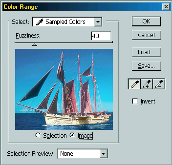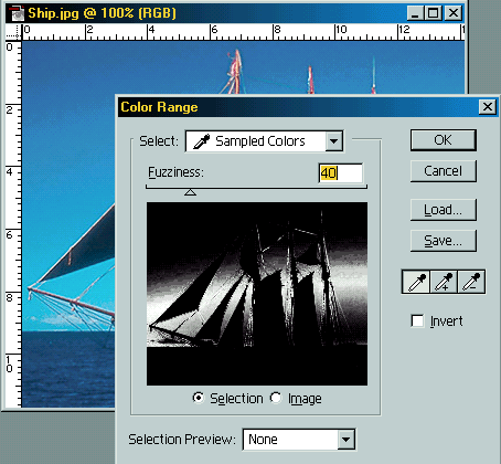 7.Ползунок Fuzziness (Размытость) выполняет функцию, аналогичную параметру Tolerance (Допуск) для инструмента Magic Wand (Волшебная палочка). Перемещайте его вправо до тех пор, пока не будет выделена как можно большая область кораблика, но не море и небо (рис. 3.96). Светлые и более яркие фрагменты корабля остались невыделенными. Чтобы включить их в выделенную область, надо указать их цвет. Выберите инструмент Plus Eyedropper (Пипетка плюс) в диалоговом окне Color Range (Выбор цвета). С его помощью можно добавлять к выделенной области произвольные цвета (рис. 3.97). Щелкните инструментом Plus Eyedropper (Пипетка плюс) на фоне неба.8.После добавления цветов вам придется исключить лишние оттенки, поскольку в выделенную область попали и участки неба и моря. Удалим их из выделенной области с помощью инструмента Minus Eyedropper (Пипетка минус), имеющегося в диалоговом окне Color Range (Выбор цвета). Выберите этот инструмент и щелкните на тех фрагментах изображения, которые следует убрать из выделения. Маска скорректирована. ![]() Рис. 3.97. Добавление в маску областей с дополнительными цветами а
